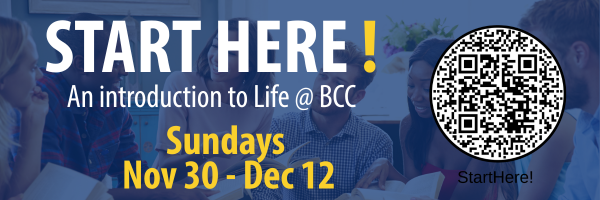 Starting November 30, START HERE!. What is Starthere! ? Great question. I am glad you asked - START HERE is a 4 week group experience for those new to the church who are looking to get to know BCC and one another a little better.